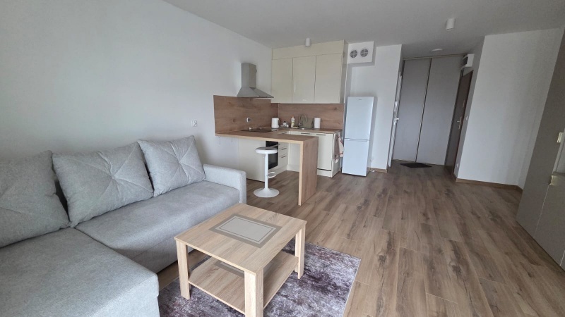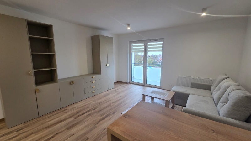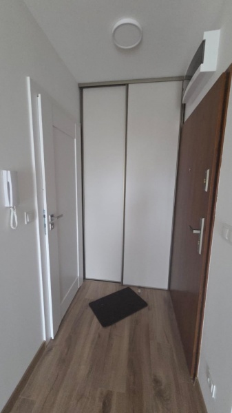 Mieszkanie jest zupełnie nowe, posiada wyposażony aneks kuchenny (lodówka, piekarnik, płyta indukcyjna, zmywarka), łazienkę z prysznicem i pralką, oraz meble pokojowe (szafy, narożnik, stolik kawowy).